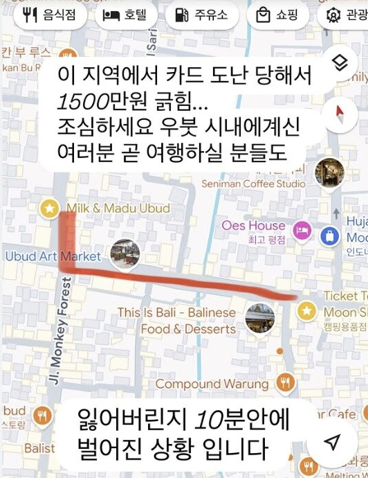 전혜빈은 2일 인스타그램에 발리 우붓 지도를 올리면서 "이 지역에서 카드 도난당해서 1500만 원 긁힘, 우붓 시내에 계신 여러분 곧 여행하실 분들도 조심하세요, 잃어버린 지 10분 안에 벌어진 상황입니다"라고 적었다.
