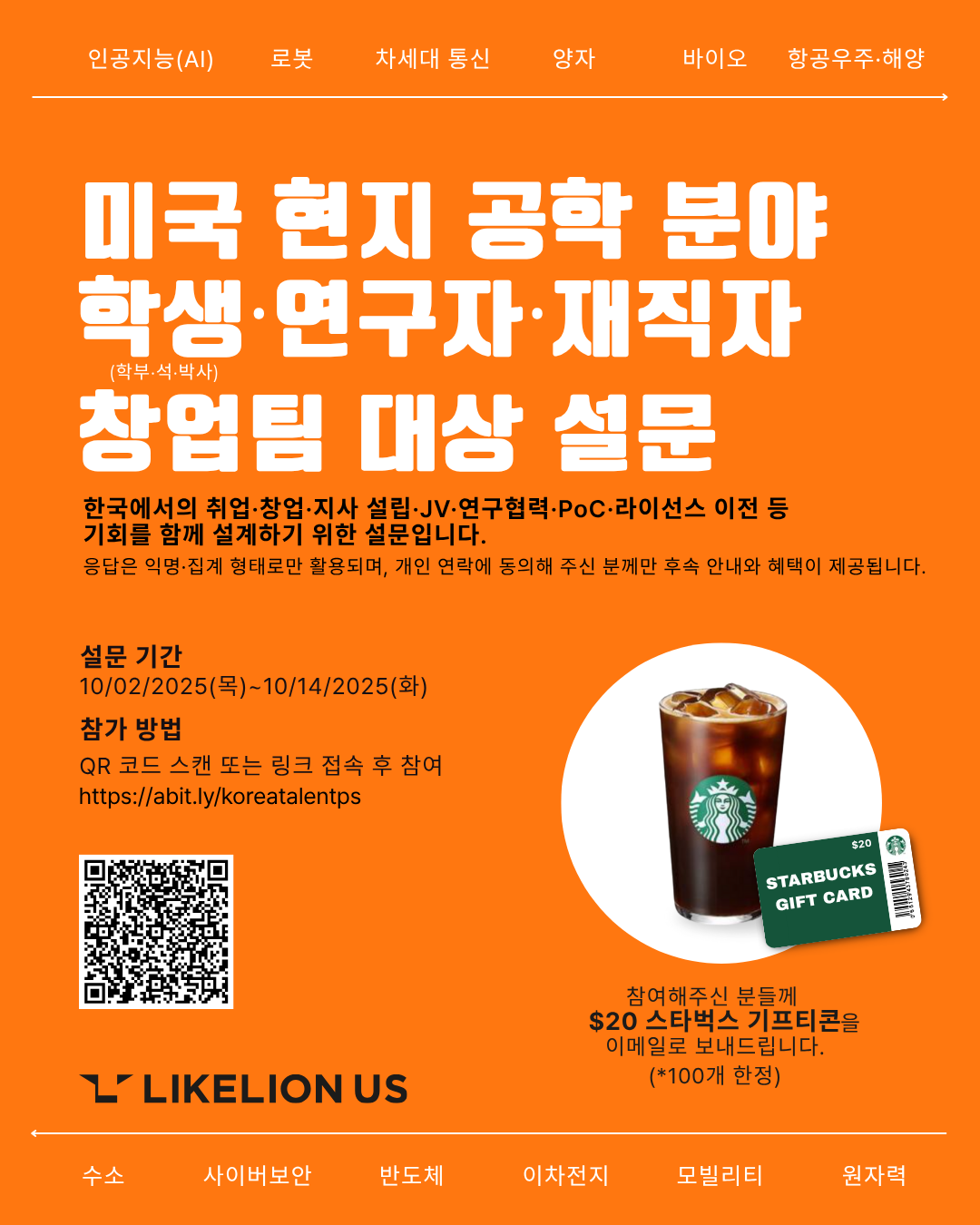 [$20 스벅쿠폰] 미국에서 공학 분야 학부생, 석·박사생, 박사후연구원(포닥),재직자, 창업팀 대상 설문조사