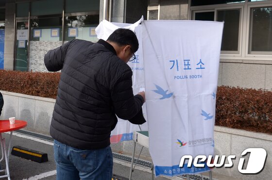 화물연대 파업 16일째인 9일 오전 광주 광산구 진곡화물공영차고지 내 화물연대 광주본부에서 광주 본부 조합원들이 총파업 종료와 현장 복귀 찬반투표를 위해 기표소에 들어서고 있다. 2022.12.9/뉴스1 © News1 이승현 기자 |