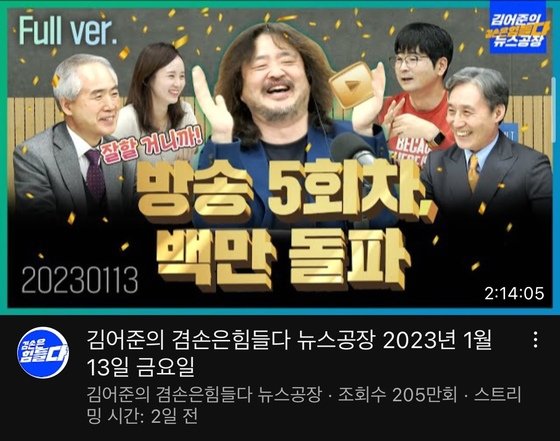 13일 오전 김어준씨의 유튜브 '김어준의 겸손은 힘들다 뉴스공장' 채널은 지난 9일 첫 방송 이후 나흘 만에 구독자 100만명을 돌파했다.