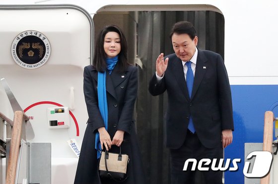 윤 대통령과 김 여사는 이달 14일 UAE 국빈 방문과 스위스 다보스 포럼 참석차 6박 8일 일정의 새해 첫 순방길에 올랐다. 윤 대통령 내외는 검은색 정장에 파란색 넥타이와 목도리로 커플룩을 착용했다.