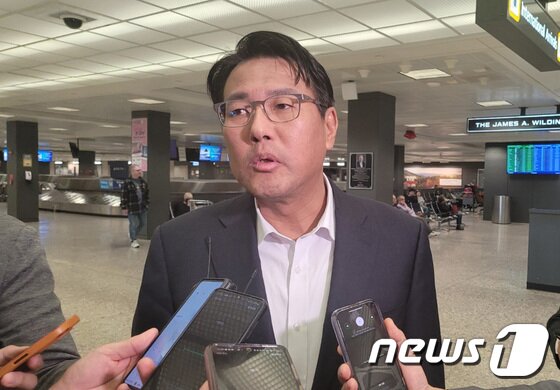 미국을 방문한 김태효 대통령실 국가안보실 1차장이 11일(현지시간) 워싱턴DC 인근 덜레스 국제공항에서 특파원들과 만나 질문에 답하고 있다. 2023.4.12/뉴스1 © News1 김현 기자 |