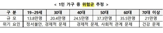 이는 한국리서치가 지역·성·연령을 고려해 무작위로 추출한 1인 가구 9471명을 대상으로 지난해 11~12월 두 달 간 온·오프라인 조사를 거쳐 위험군(2023명·21.3%)을 선별한 후 주된 위기 요인을 분석한 결과다.