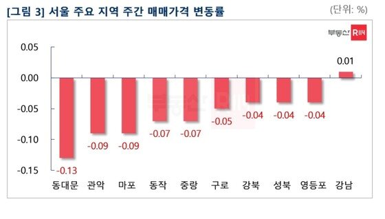 서울은 구축 단지 대형평형 위주로 약세가 이어진 가운데 △동대문(-0.13%) △관악(-0.09%) △마포(-0.0%) △동작(-0.07%) 등 순으로 떨어졌다.
