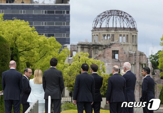 주요 7개국(G7) 회원국 정상들이 19일 히로시마 평화기념공원에 서 있는 모습. 이들 뒤로 원폭 돔이 보인다. 23.05.19 © 로이터=뉴스1 © News1 김예슬 기자 |