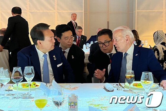 윤석열 대통령이 지난 20일 일본 히로시마 그랜드프린스호텔에서 열린 G7 정상회의 친교만찬에서 조 바이든 미국 대통령과 대화하고 있다. (대통령실 제공) © News1 오대일 기자 |