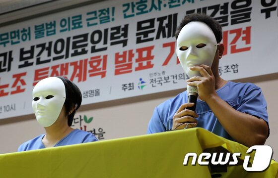 보건의료노조 관계자들과 가면을 쓴 의료기관 소속 PA 간호사 및 방사선사들이 25일 서울 영등포구 전국보건의료산업노조 사무실에서 열린 '보건의료 근본 과제 해결 촉구' 기자회견에서 직종 업무 범위 명확화, 무면허 불법 의료 근절, 간호사 처우개선 등을 촉구하고 있다. 2023.5.25/뉴스1 © News1 이동해 기자 |