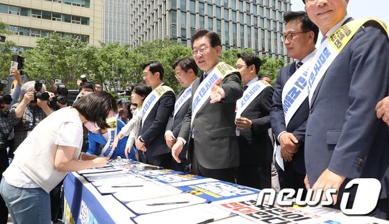이재명 더불어민주당 대표가 26일 서울 광화문광장 이순신 동상 앞에서 열린 후쿠시마 원전 오염수 해양투기 및 수산물 수입 반대 국민서명운동 발대식에서 시민들의 서명 동참을 독려하고 있다. 2023.5.26/뉴스1 © News1 허경 기자
