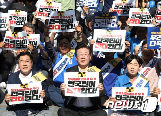 이재명 민주당 대표는 이날 오후 부산 서면에서 열린 '후쿠시마 오염수 방류 반대 영남권 규탄대회'에 참석해 윤 대통령을 향해 "대한민국의 영토를, 바다를 더럽히는 오염수 방출, 절대 안 된다고 천명하라"고 촉구했다.