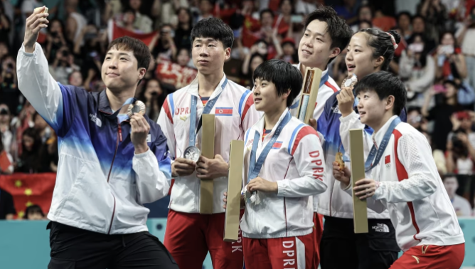 2024 파리 올림픽 탁구 혼합복식 시상식에서 남북 선수들이 함께 찍은 사진이 프랑스 현지에서도 주목받고 있다.