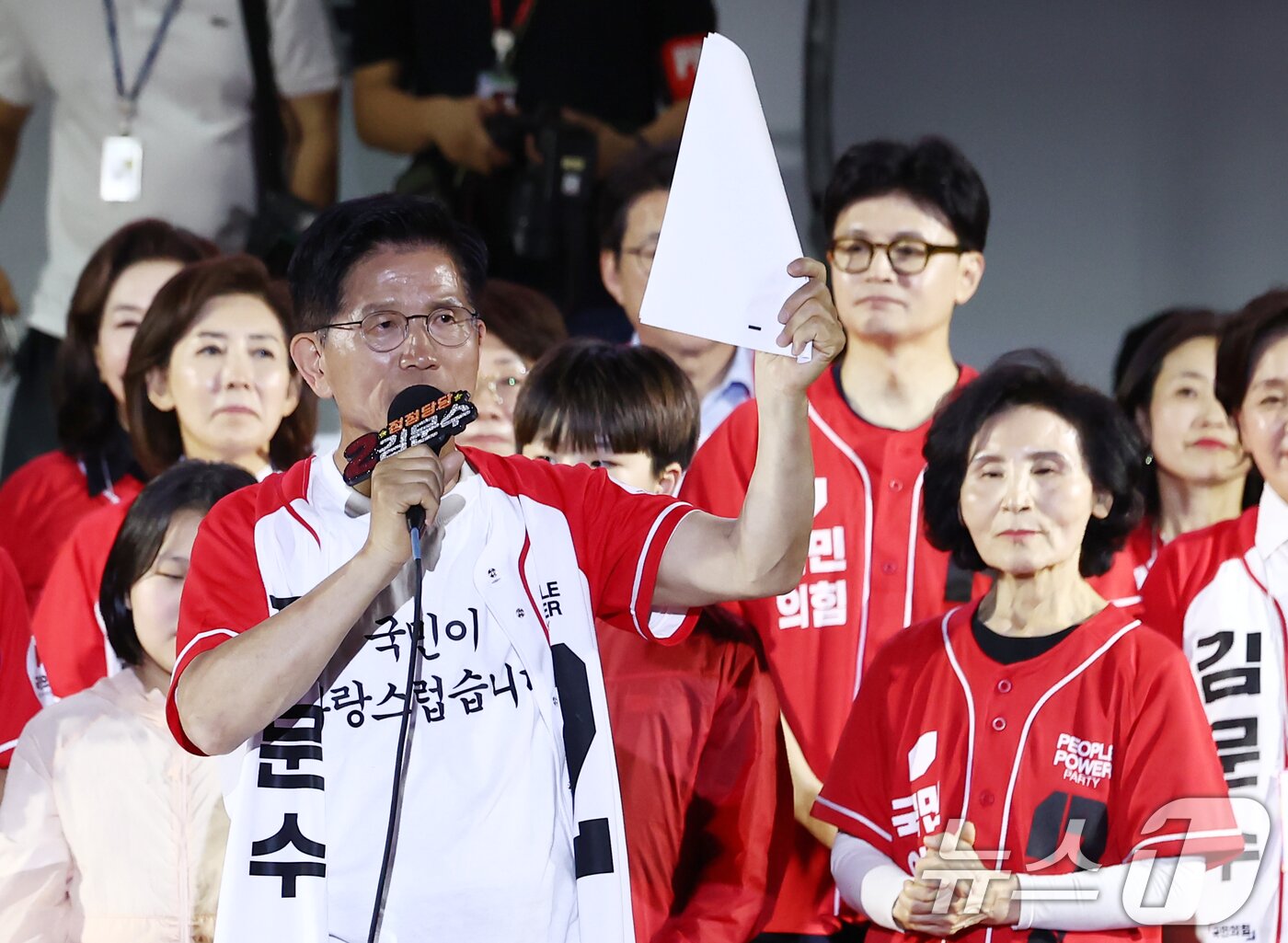 마지막 유세 때는 당내 경선에서 겨뤘던 한동훈 전 대표와 나경원 의원, 양향자 전 의원 등이 한자리에서 '원팀' 유세를 했다. 김 후보의 배우자 설난영 여사, 딸 동주 씨 등도 무대에 함께 올랐다. 현장에는 김건, 박정훈, 배현진, 진종오 등 친한(한동훈)계부터 친윤(윤석열)계 김민전, 인요한 등 의원들이 다수 참석했다.
