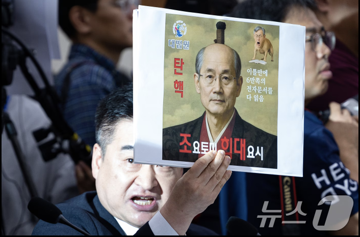 최혁진 무소속 의원은 조 대법원장의 얼굴에 일본식 상투를 튼 모습을 합성한 '조요토미 희대요시' 사진이 담긴 손팻말을 들고 "윤석열이 조 대법원장을 임명한 것은 대한민국 대법원을 일본의 대법원으로 만들려는 전략적 선택이었다"고 주장했다.