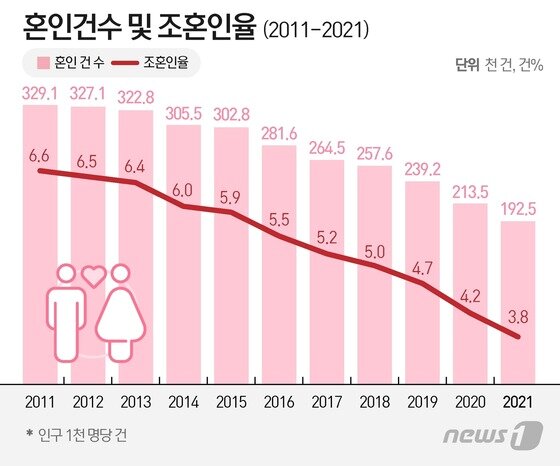 혼인 건수는 지난 2011년 소폭 증가세를 보인 이후 2012년부터 지난해까지 10년 연속 감소세를 이어가고 있다. 2019년에는 23만9000건으로 1971년의 최저 건수를 48년 만에 경신한 데 이어 2020년과 2021년에 잇따라 최저치를 갈아치우고 있다.