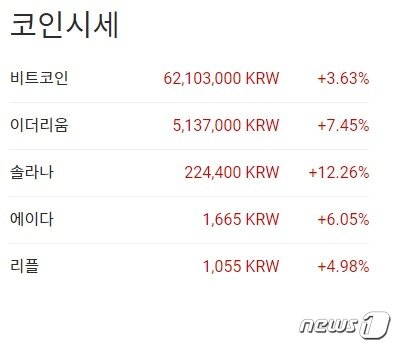 같은 시각 한국의 거래사이트인 업비트에서도 비트코인은 24시간 전보다 3.63% 상승한 6210만3000원에 거래되고 있다.