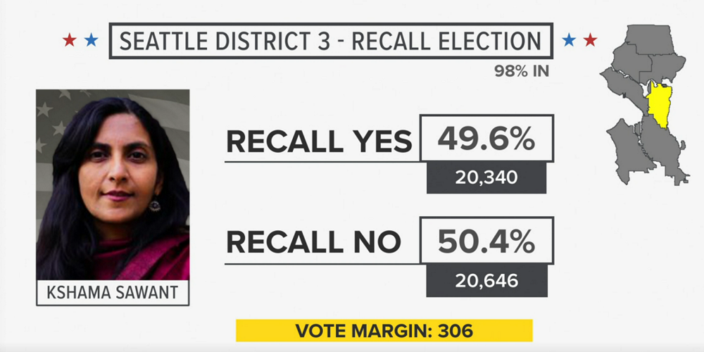 시애틀 사회주의자 시의원 샤마 사완트 의원이 최종적으로 의원직 박탈을 면하게 됐다. 지난 7일 실시된 특별 소환 주민투표에서 개표 첫날 찬성이 많이 소환될 것으로 예상됐으나 뒷심을 발휘하면서 최종적으로 주민 소환 반대표를 더 많이 확보하게 된 것이다.