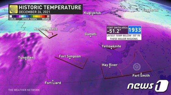 캐나다 기상 전문 채널인 웨더네트워크는 26일(현지시간) 오후 캐나다 노스웨스트준주 래빗케틀에서 영하 51.1도가 관측됐다고 보도했다. 영하 51도 이하 온도가 관측된 건 지난 2013년 2월 누나부트준주의 유레카에서 측정된 이후 8년 만이다.