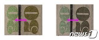 국정원이 밝힌 '슈퍼노트 급' 위조지폐와 진폐의 차이점. 시변색(示變色) 잉크가 진폐(왼쪽)는 녹색↔금색으로의 변화가 명확한 반면, 위폐(오른쪽)는 청녹색↔흑색으로 변색돼 차이가 선명하다.(국정원 제공)© 뉴스1 |