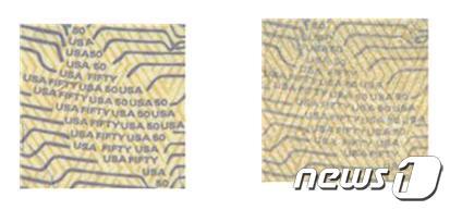 국정원이 밝힌 '슈퍼노트 급' 위조지폐와 진폐의 차이점. 위폐(오른쪽)의 인물 그림 주변 미세문자 (50ㆍUSAㆍFIFTY)가 진폐(왼쪽)에 비해 희미한 것을 볼 수 있다.(국정원 제공)© 뉴스1 |