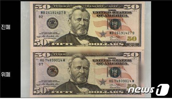 다만 확대경으로 살펴보면 위폐에 그려진 인물 주변의 미세문자(50, FIFTY)가 진폐에 비해 희미하고, 우측 하단의 액면 숫자색도 각도에 따라 진폐와 차이가 나는 것으로 확인됐다고 국정원은 전했다.