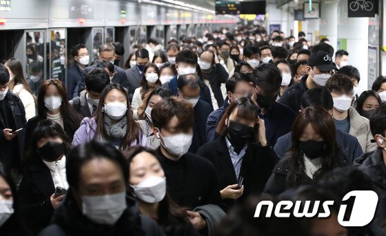 24일 오전 서울 세종대로 지하철 광화문역에서 마스크를 착용한 시민들이 출근길 발걸음을 재촉하고 있다. 2021.11.24/뉴스1 © News1 임세영 기자 |