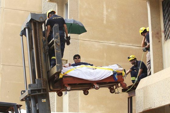 압둘라 국왕의 인도적 차원의 배려로 크레인을 타고 병원에 이송되는 알 샤에리의 모습. (더 선 갈무리) © 뉴스1 |