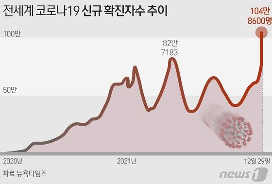 오미크론이 전 세계를 휩쓸면서, 신종 코로나바이러스 감염증(코로나19) 확진자가 처음으로 하루 평균 100만 명을 돌파했다.