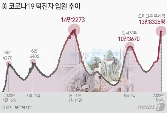 미 보건복지부(HHS)도 9일 기준 코로나19 환자가 13만8326명에 달했다고 집계했다. 이는 코로나19 입원율이 절정에 달했던 지난해 1월 환자 수 14만2273명에 근접한 수치다.