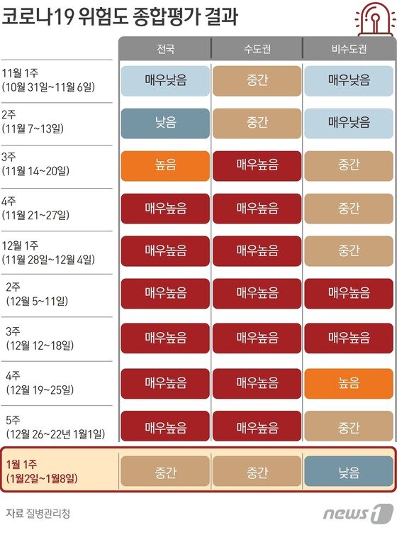중앙방역대책본부가 주간 단위로 발표하는 코로나19 위험도 평가에서 1월1주차 전국 및 수도권의 위험도는 '중간'으로, 비수도권은 '낮음'으로 하향 조정됐다. 11월 단계적 일상회복 이후 11월3주차에 '매우 높음' 단계에 도달했던 수도권 위험도는 8주만에 하향 조정됐다.