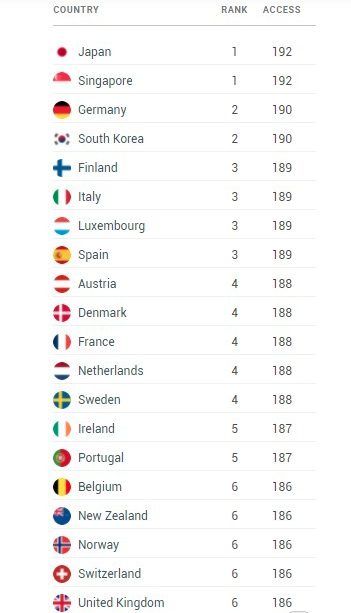 이번 발표에서 1위는 일본과 싱가포르로 여권지수 192를 기록했다. 이에 따르면 일본과 싱가포르 여권을 소지한 사람은 이론적으로 192개 국가를 무비자로 여행할 수 있다.