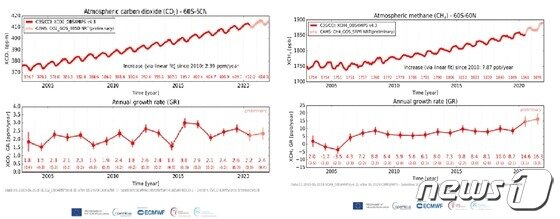 | 코페르니쿠스 기후변화서비스에서 공개한 자료로 이산화탄소(좌)와 메탄(우) 등 온실가스 농도가 매년 증가하고 있다는 것을 알 수 있다. 2022.01.12/news1 © 뉴스1(코페르니키스 기후변화서비스 홈페이지 갈무리) |
