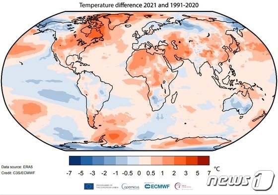 11일(현지시간) USA투데이에 따르면 유럽연합(EU) 산하 코페르니쿠스 기후변화서비스는 지난 7년 동안 측정한 지구 기온이 '명백히' 가장 높았으며, 작년 2021년이 지구 기온이 다섯 번째로 따뜻한 해였다고 밝혔다. 단체에 따르면 가장 따뜻한 해는 2020년과 2016년이었다.