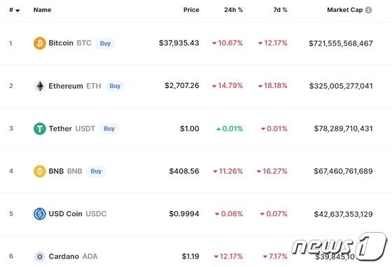 이날 비트코인 등 암호화폐는 일제히 폭락하고 있다. 비트코인은 22일 오전 6시 30분 현재(한국시간 기준) 글로벌 코인시황 중계사이트인 코인마켓캡에서 24시간 전보다 10.67% 폭락한 3만7935달러를 기록하고 있다.