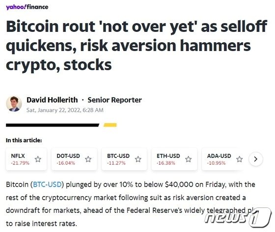 비트코인이 폭락하고 있는 것은 월가에서 기술주 매도세가 출현하며 연일 나스닥이 급락하고 있기 때문이다. 나스닥은 21일(현지시간)에도 2.72% 급락해 전고점 대비 12% 이상 하락했다.