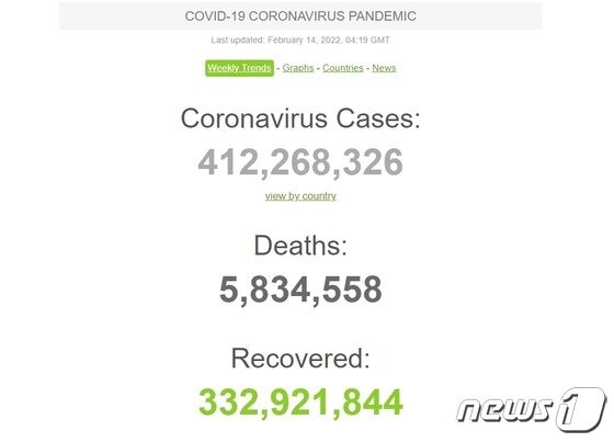 전 세계 코로나19 누적 확진자 수가 2022년 2월 8일 기준 4억1220명을 돌파했다. © 뉴스1 (월드오미터 캡처) |