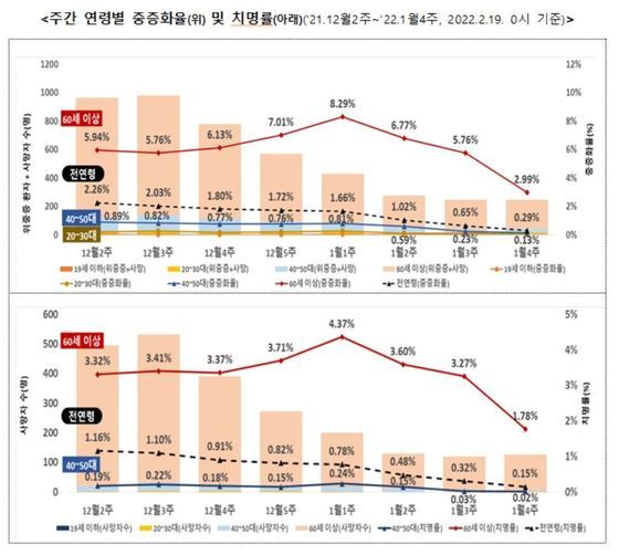 지난해 12월 2주차 전연령의 중증화율은 2.26%에서 1월 4주차 0.29%로 내려왔다. 60세 이상 연령층의 중증화율은 12월 2주차 5.94%에서 1월1주차 8.29%까지 상승했다가 1월 4주차 2.99%로 감소했다.