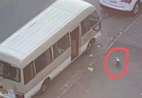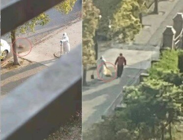 버스가 떠난 뒤 방역복을 입은 요원이 반려견 사체를 치우고 있다. (웨이보 갈무리) © 뉴스1 |