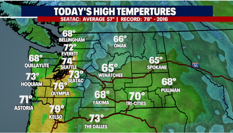 시택공항보다 윗쪽인 노스 시애틀 등은 이날 74도까지 올라갔으며 올림피아가 76도, 켈소가 79도까지 올라갔다.