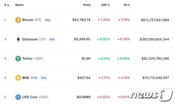 비트코인은 9일 오전 6시50분 현재(한국시간 기준) 글로벌 코인시황 중계사이트인 코인마켓캡에서 24시간 전보다 1.30% 하락한 4만2783달러를 기록하고 있다.