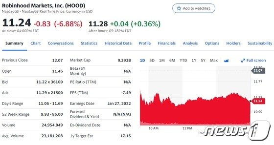 8일(현지시간) 뉴욕증시에서 로빈후드의 주가는 전거래일보다 6.88% 하락한 11.24달러를 기록했다.