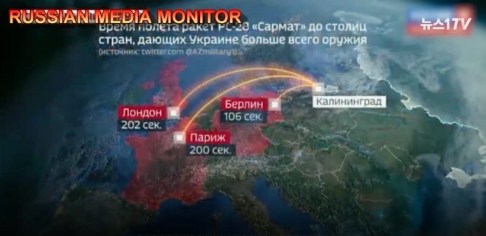 더 나아가 프로그램의 진행자는 "러시아의 핵미사일이 발사되면 베를린은 106초, 파리는 200초, 런던은 202초 만에 타격 된다"고 설명하고 진행자들의 뒤로는 시뮬레이션 지도가 방영됐다.