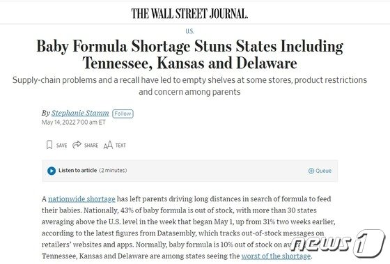 코로나19로 인한 공급망 붕괴로 미국에서 분유대란이 발생하면서 부모들이 분유를 찾기 위해 멀리 여행을 떠나는 ‘분유 찾아 삼만리’가 연출되고 있다고 월스트리트저널(WSJ)이 14일(현지시간) 보도했다.