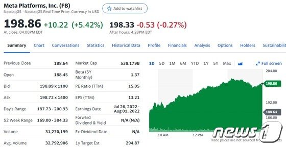 이날 뉴욕증시에서 메타의 주가는 전거래일보다 5.42% 급등한 198.86달러를 기록했다.