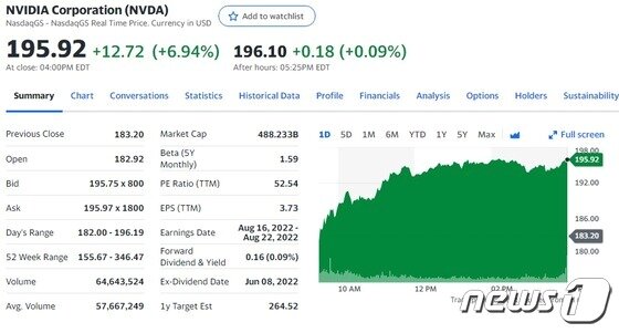 엔비디아는 이날 전거래일보다 6.94% 급등한 195.92달러를 기록했다. 엔비디아의 급등으로 필라델피아 반도체지수도 3.5% 급등했다.