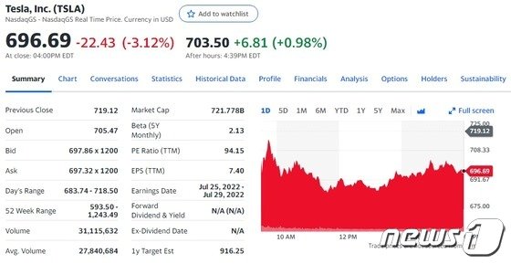 10일(현지시간) 뉴욕증시에서 테슬라는 전거래일보다 3.12% 하락한 696.69달러를 기록했다. 테슬라가 ‘육백슬라’로 밀린 것은 지난 5월 26일 이후 처음이다.