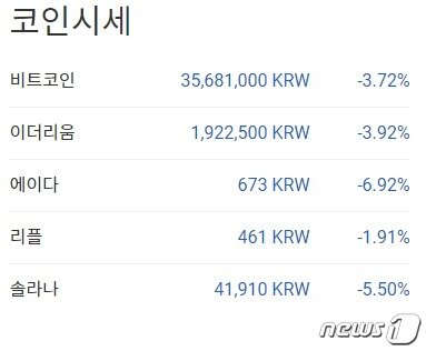 같은 시각 한국의 거래사이트인 업비트에서도 비트코인은 24시간 전보다 3.72% 하락한 3568만1000원에 거래되고 있다.
