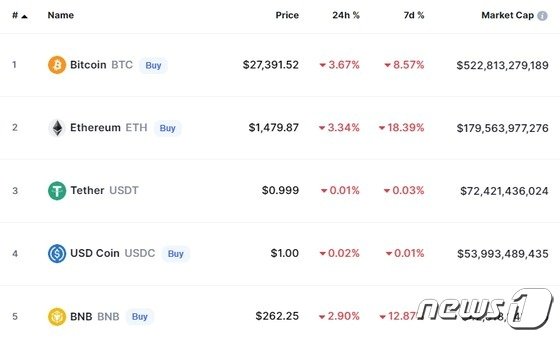 비트코인은 13일 오전 6시 현재(한국시간 기준) 글로벌 코인시황 중계사이트인 코인마켓캡에서 24시간 전보다 3.67% 하락한 2만7391달러를 기록하고 있다.