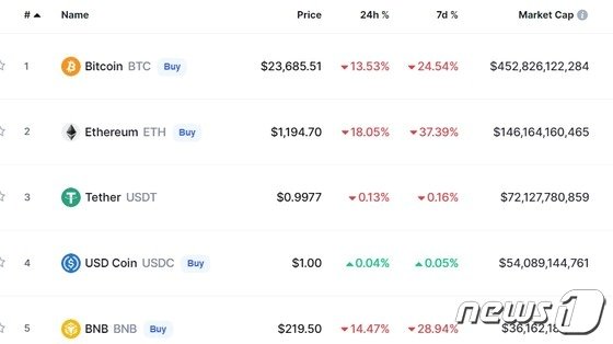 비트코인은 13일 오후 8시30분 현재(한국시간 기준) 글로벌 코인시황 중계사이트인 코인마켓캡에서 24시간 전보다 13.53% 폭락한 2만3685달러를 기록하고 있다.