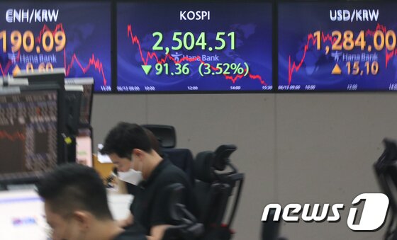 13일 오후 서울 중구 하나은행 명동점 딜링룸 전광판에 코스피지수가 전 거래일 대비 91.36포인트(3.52%) 하락한 2504.51을 나타내고 있다. 2022.6.13/뉴스1 © News1 송원영 기자 |