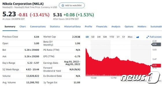 전기트럭 스타트업인 니콜라는 전거래일보다 13.41% 폭락한 5.23달러를 기록했다.