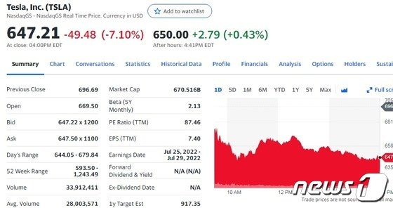 13일(현지시간) 뉴욕증시에서 테슬라의 주가는 전거래일보다 7.10% 급락한 647.21달러를 기록했다.